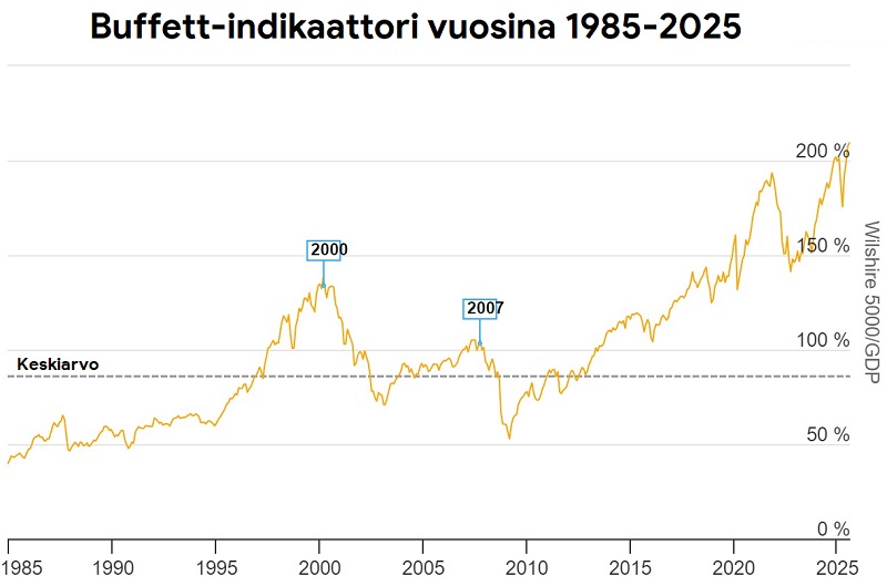 Myös niin sanottu Buffett-indikaattori saattaa tällä hetkellä herättää huolta.