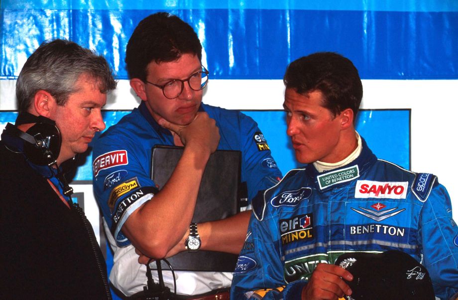 Pat Symonds (vas.) sai maistaa menestystä Michael Schumacherin (oik.) ja Benetton-tallipäällikkö Ross Brawnin kanssa. ZumaWire / MVPHOTOS