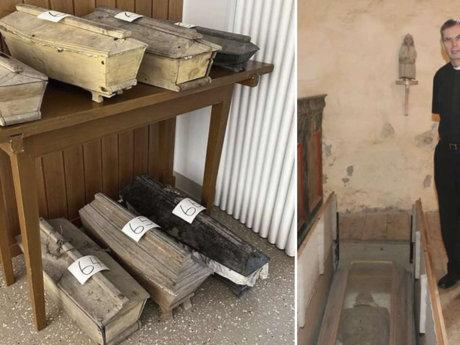 Tammelan kirkkomaan hautaholvista löytyi viime kesänä lukuisia muumioituneita vainajia. Suuri osa heistä oli eri-ikäisiä lapsia. Keminmaan kirkkoherra Rungius kuoli 1600-luvulla, mutta on säilynyt huomattavan hyvin. Rungiusta oikeanpuolisessa kuvassa esittelee Keminmaan tuon hetkinen kirkkoherra Yrjö Haapala vuonna 2015. Tammelan seurakunta/IL Arkisto