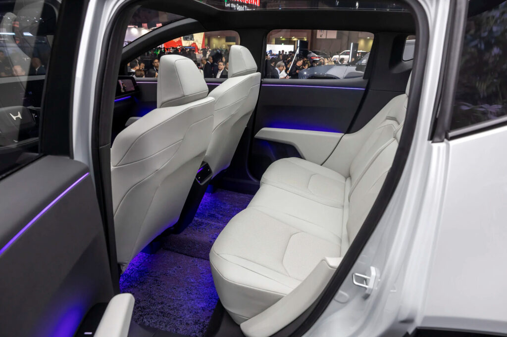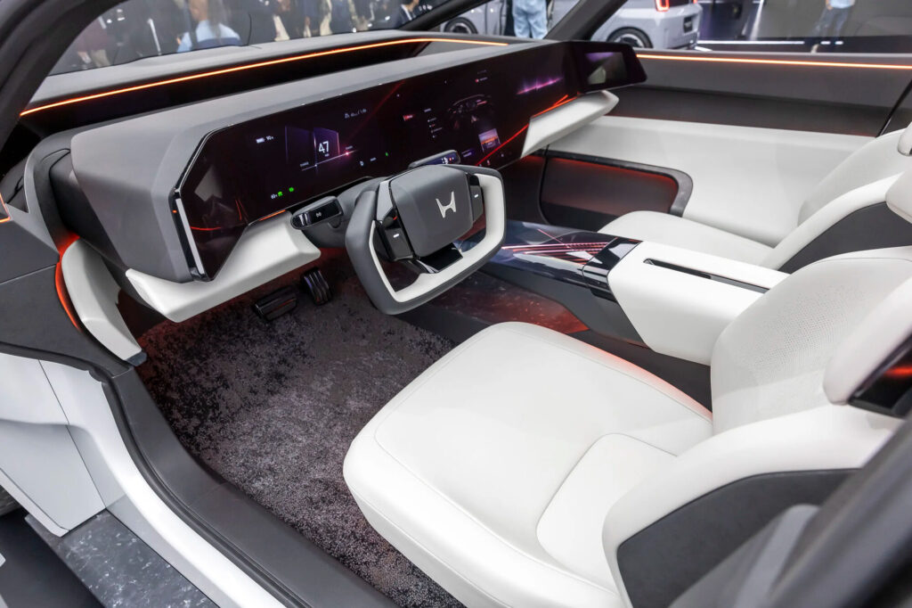 SUV-mallin kojelauta on käytännössä pelkkää näyttöä, sillä päissä ovat myös digipeilien näytöt samaan tapaan kuin Honda E:ssä. Pieni ohjauspyörä kielii siitä, että ainakin koemallissa on sähköinen ohjaus.