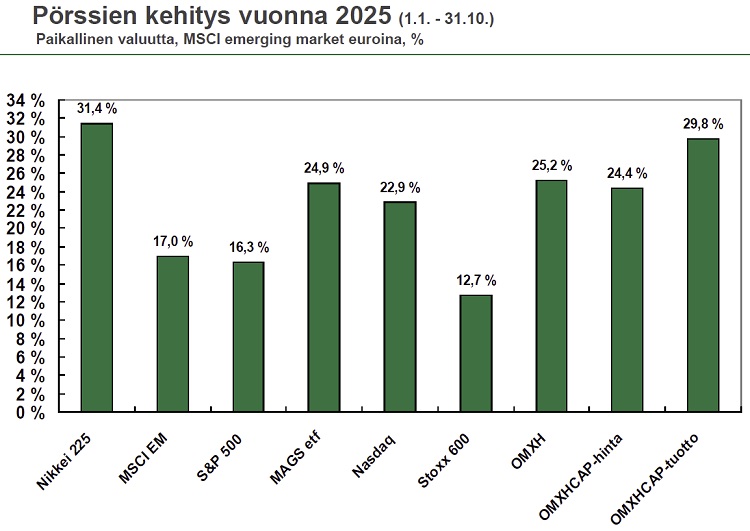 Japanin uusi pääministeri Sanae Takaichi, joka on aiemmin luonut uraa heavybändin rumpalina, tapasi viikolla presidentti Donald Trumpin. Markkinat uskoivat Japanin talouden uuteen elvytysaaltoon, ja Nikkei 225 -indeksi kirjasi viikolla kolmena päivänä uuden ennätyksen.