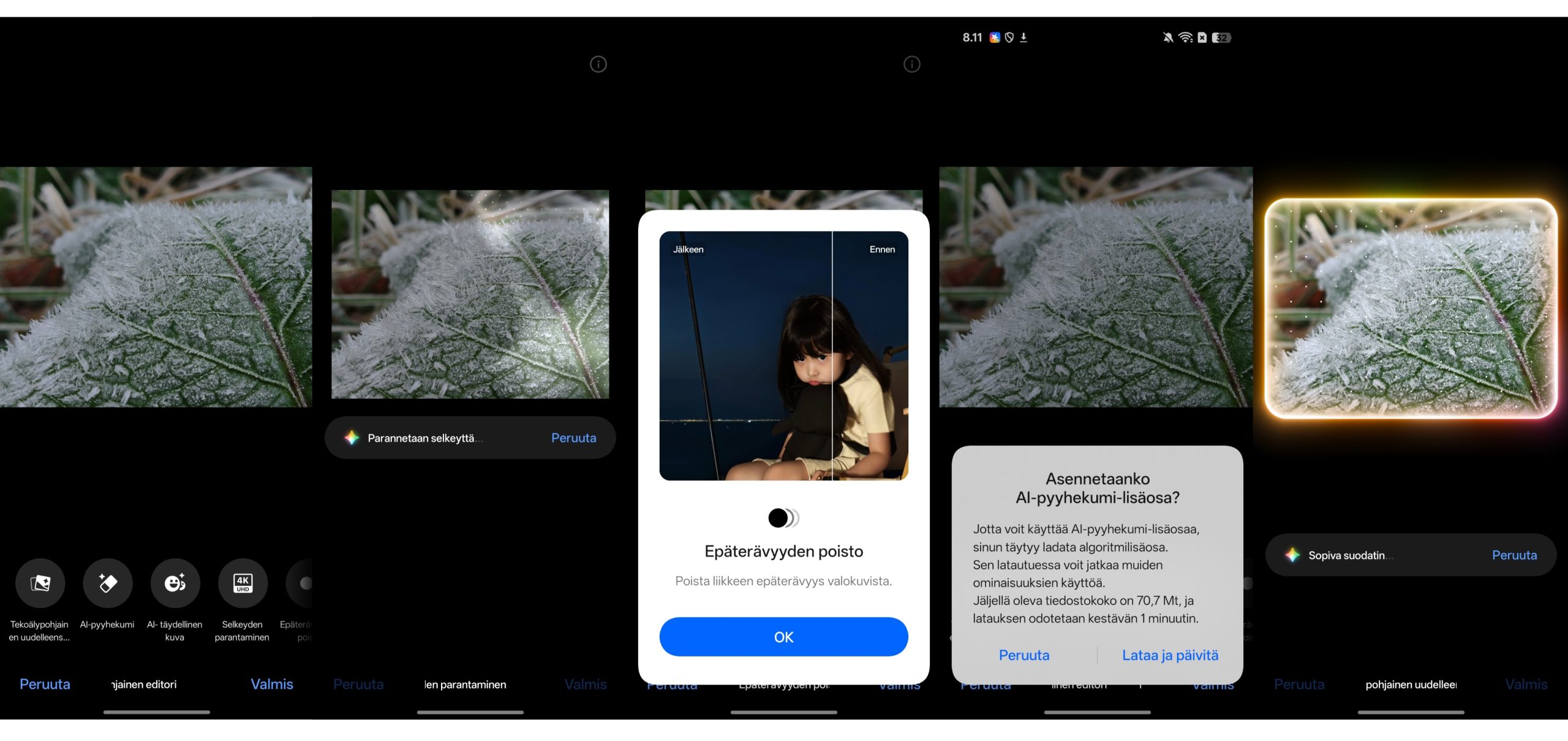 Myös Oppo panostaa luonnollisesti tekoälyyn, ja ColorOS sisältääkin monia älykkäitä toimintoja esimerkiksi valokuvaamisen tueksi ja kuvien sekä videoiden muokkaamiseksi. Ylimääräisiä asioita on helppo poistaa tekoälypyyhekumilla, kiinni jääneet silmät avata jälkikäteen tai nostaa tärähtäneen otoksen tarkkuutta muutamalla napautuksella.