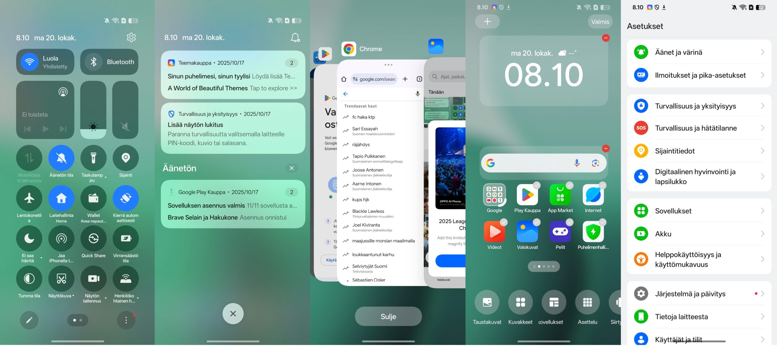 Ruutukaappauksia ColorOS-ohjelmiston käyttöliittymästä.