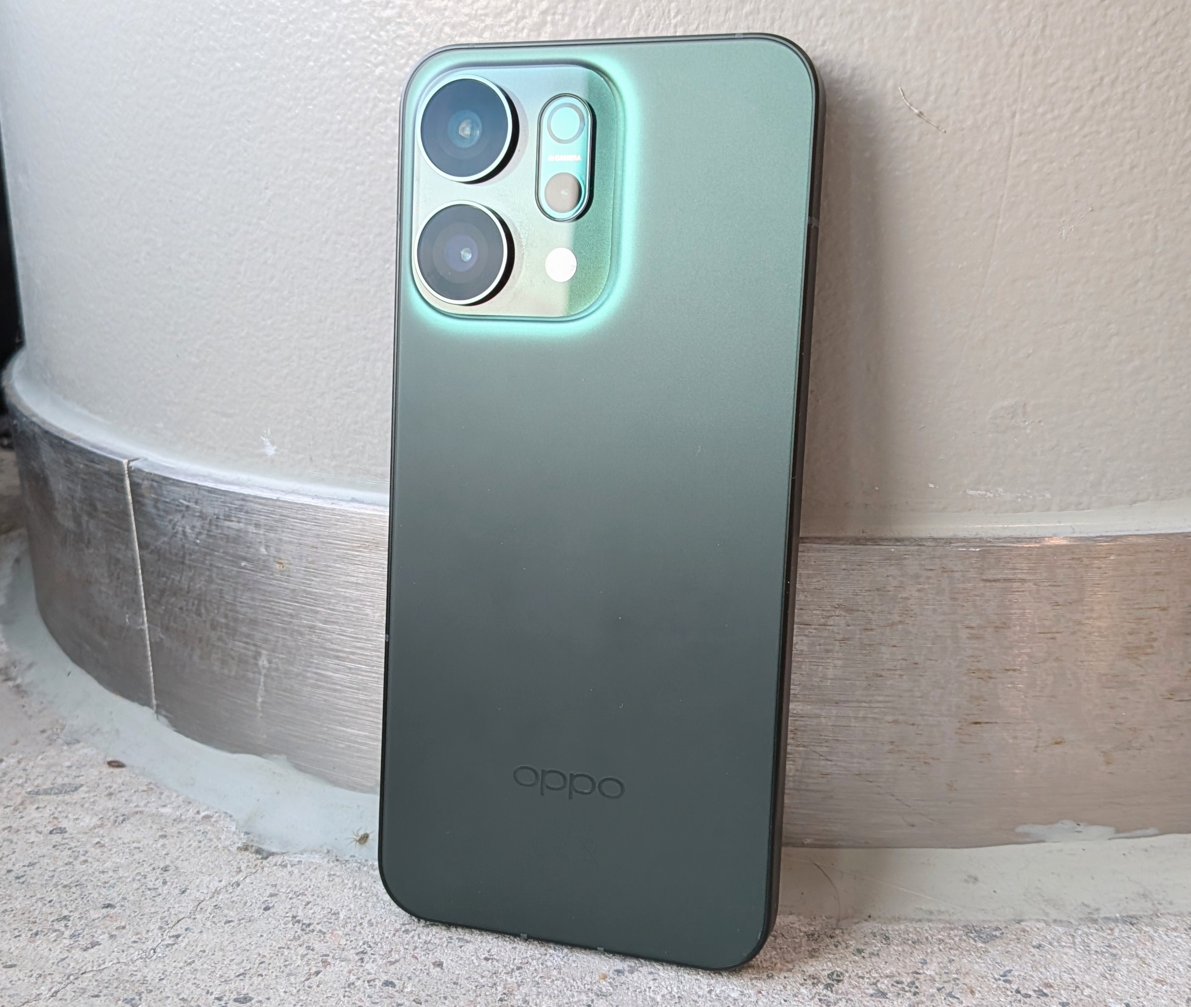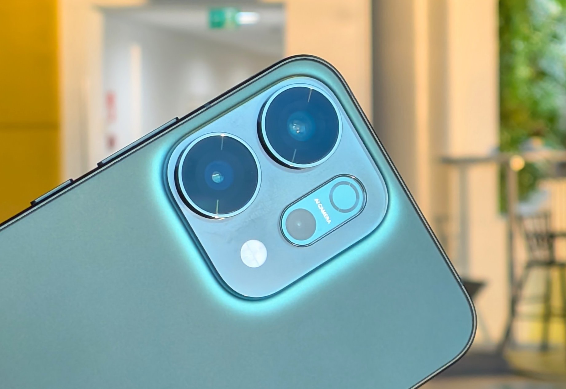 Vihreässä värissä kamerakohoumaa kiertää muuta pintaa vaaleampi reunus, minkä ansiosta neliömäisen alueen alta näyttää ikään kuin hohtavan valoa luoden Reno14 5G:hen hauskan esteettisen yksityiskohdan.