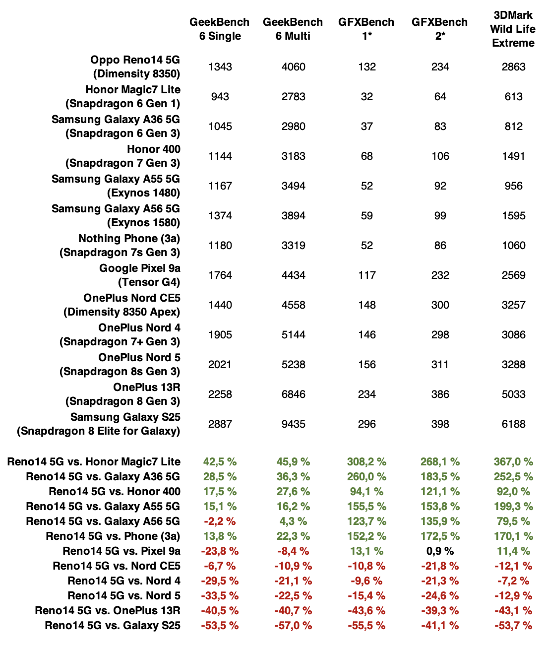 Suorituskykytesteissä Dimensity 8350:n voimin Reno14 5G peittoaa selvästi alemman keskihintaluokan puhelimet, kuten Samsung Galaxy A56 5G:n ja ja Honor 400:n, mutta jää toisaalta selvästi jälkeen jo OnePlus Nord 5:stä puhumattakaan esimerkiksi OnePlus 13R:stä.