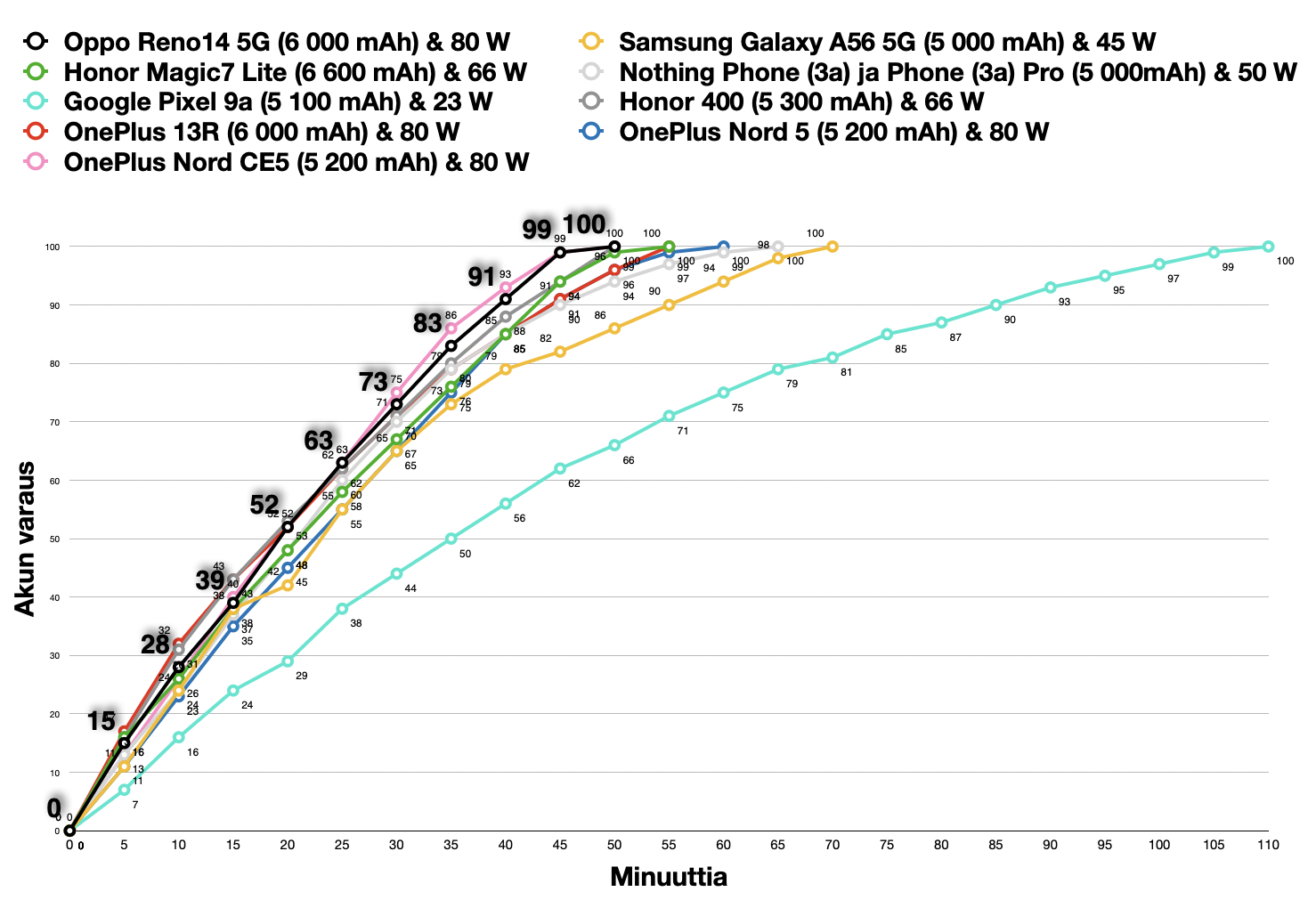 Oppo Reno14 5G myös latautuu ripeästi 80 watin teholla. Vain vartissa varausta kertyy noin 40 prosenttia, ja täyteen akku latautuu noin 45 minuutissa. Suoritus on vahva erityisesti huomioiden akun kapasiteetin.