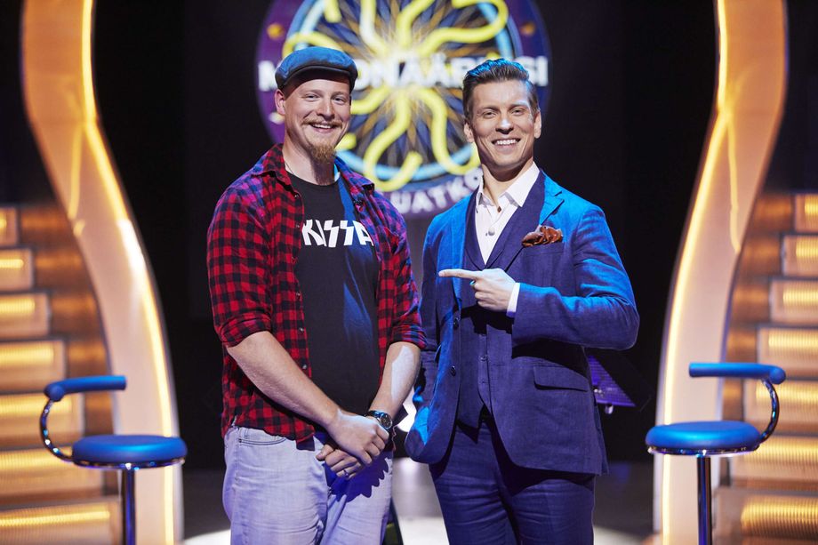 Eetu Korhonen on tänään Neloselta tulevan jakson toinen kilpailija. Oikealla pidetty juontaja Antti Holma. NUMI NUMMELIN, Sanoma