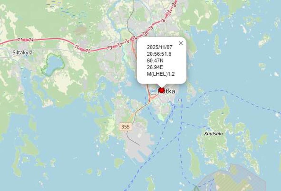 Kotkassa koettiin maanjäristys. Kuvakaappaus Seismologian instituutin verkkosivuilta. Seismologian instituutti