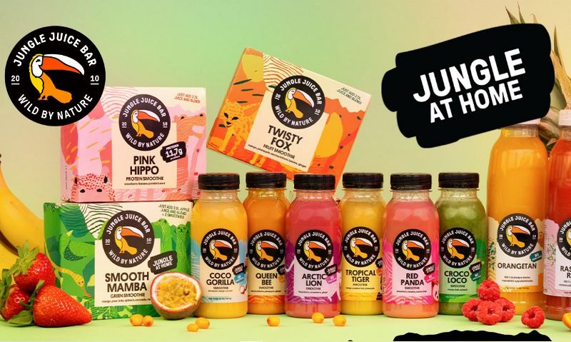 Jungle Juice Bar tarjoaa mehuja ja smoothieita paitsi 40 baarissaan myös oman Jungle At Home -tuoteperheen muodossa ”hyvinvarustelluissa ruokakaupoissa”. Mehubaareissa myytävät tuotteet valmistetaan tuoreista hedelmistä paikan päällä. Kuva: Junglejuicebar.com