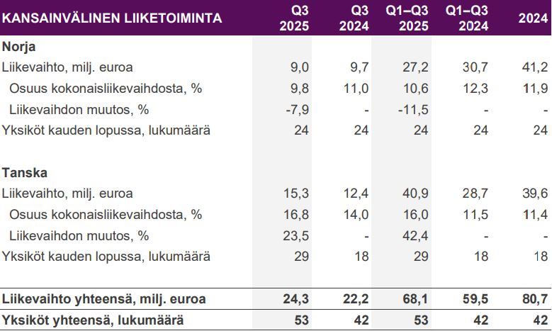 Suomen liiketoiminnan liikevaihto kasvoi 0,8 miljoonaa euroa eli 1,2 prosenttia heinä-syyskuussa. Yksittäiset liiketoiminta-alueet Suomessa säilyttivät liikevaihtonsa suunnilleen vertailukauden tasolla. Kuva: NoHo Partners, osavuosikatsaus 4.11.2025