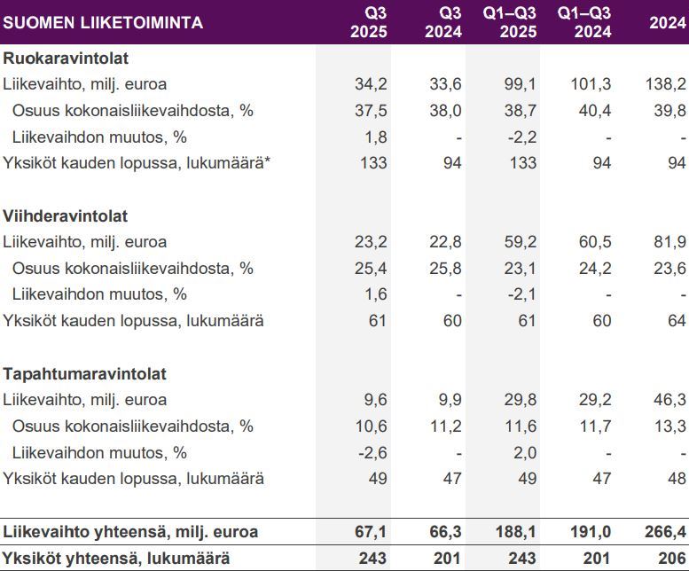 H5 Ravintoloiden vuositason liikevaihto oli ostettaessa kahdeksan miljoonaa euroa ja se ei sisälly vertailukauden eli heinä-syyskuun 2024 lukuihin. Vuoden 2025 kolmanteen neljännekseen sillä on todennäköisesti noin kahden miljoonan euron vaikutus.