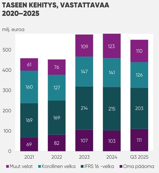 Vastattavaa-puolella oma pääoma oli syyskuussa 111 miljoonaa euroa, IFRS 16 -vuokravastuuvelka 203 miljoonaa euroa, korollinen velka 126 miljoonaa euroa ja muut velat 110 miljoonaa. Taseen tervehtymisestä kertovat oman pääoman vahvistuminen ja korollisen velan eli rahalaitoslainojen supistuminen. Kuva: NoHo Partners