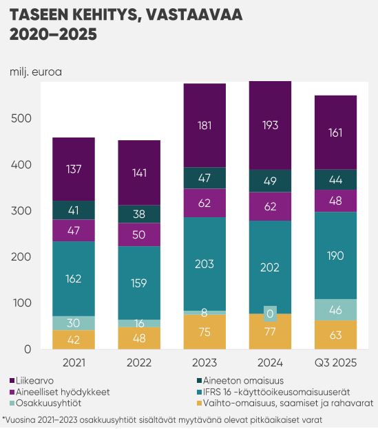 NoHo Partnersin taseen vastaavaa-puolen isoin erä on IFRS 16 -käyttöoikeusomaisuuserät eli pitkäaikaiset vuokrasopimukset. Ne ovat vastinpari taseen vastattavaa-puolen IFRS 16 -velalle. Pörssiyhtiöiden kirjanpidossa pitkäaikaiset vuokrasopimukset kirjataan kuin ne olisivat velalla rahoitettua kiinteistöomaisuutta. Kuva: NoHo Partners, osavuosiesitys 4.11.2025