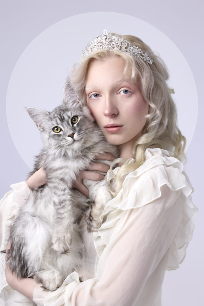 – Valokuvan ajatus on lähtenyt kissasta. Halusin, että se pohjautuu realismiin eläimen ja ihmisen yhteyden kautta. Kuitenkin värit, valaistus ja vaatteet menevät fantasiamaailman puolelle. Siinä jäädään sopivasti välimaastoon, mikä pysäyttää pohtimaan, Järvinen kuvailee.