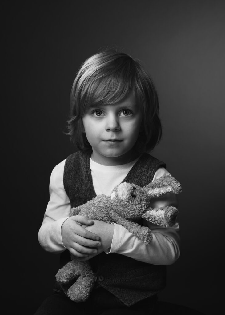 – Tästä kuvauksesta syntyi monenlaista materiaalia. Malli on melko vilkas pikkupoika, joka oli käynyt kuvauksessani aiemminkin. Hän jotenkin siinä sitten asettui pupun kanssa tietynlaiseen rooliin ja tuntui, että siinä oli klassisen muotokuvan elementit.