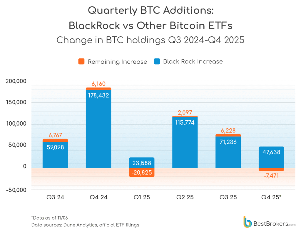 BlackRock on ollut ETF-markkinan suurin nettovirtojen lähde, lisäten hyväksynnän jälkeen yhteensä yli 496 000 Bitcoinia. Vertailun vuoksi muut spot-Bitcoin-ETF:t ovat samassa ajassa lisänneet yhteensä vain noin 46 000 Bitcoinia, ja monet – kuten Grayscale, Fidelity, 21Shares ja Franklin Templeton – ovat kirjanneet vuoden 2025 aikana nettovirtoja ulos.
