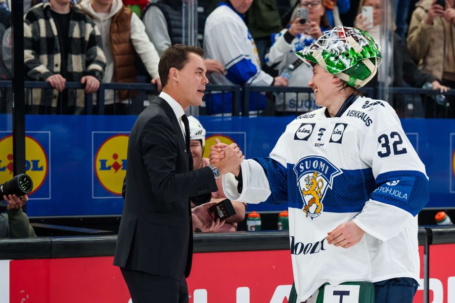 Tuukka Rask ojensi Emil Larmille palkinnon lauantaina EHT-ottelun jälkeen. Mika Kylmäniemi / Suomen Jääkiekkoliitto