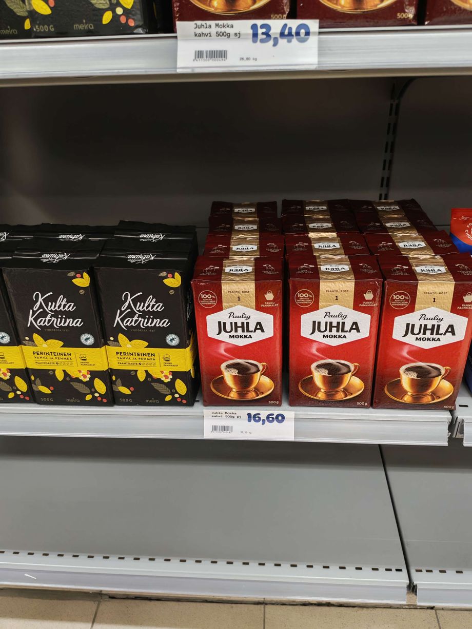 Tämä kahvipaketti löytyy vastikään uudistetun Huili Pukaron Paroni -huoltoaseman hyllystä Lapinjärvellä. Kyseessä on pannujauhettu kahvi. Ylemmältä hyllyltä löytyvän suodatinjauhetun Juhla Mokan hinta on 13,40 euroa puolelta kilolta.