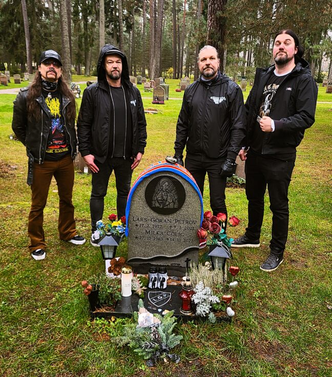 Amorphis-jäsenistöä LG Petrovin haudalla. Kuva: Timo Isoaho