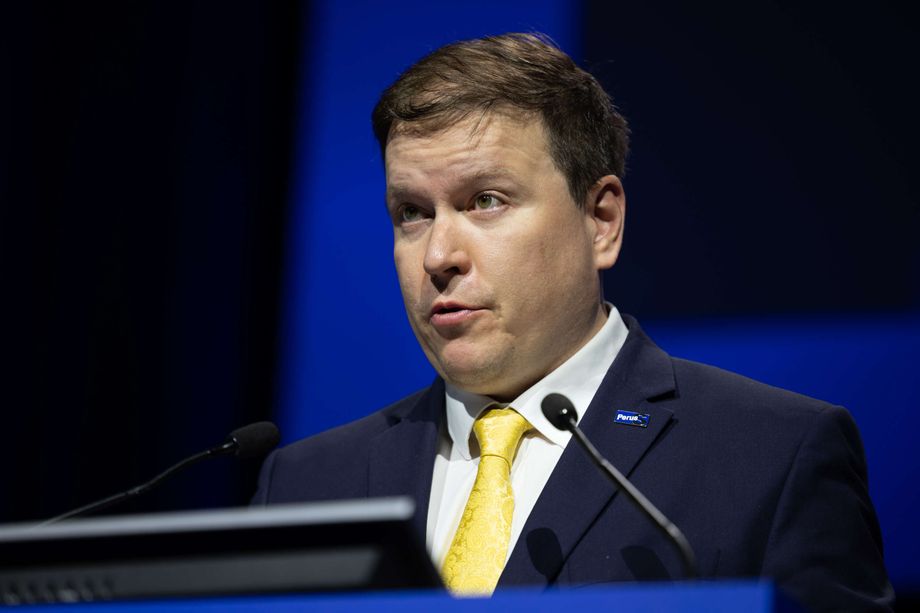 Ulkomaankauppa- ja kehitysministeri Ville Tavio (ps) perussuomalaisten puoluekokouksessa Lahdessa 15.6.2025. Inka Soveri