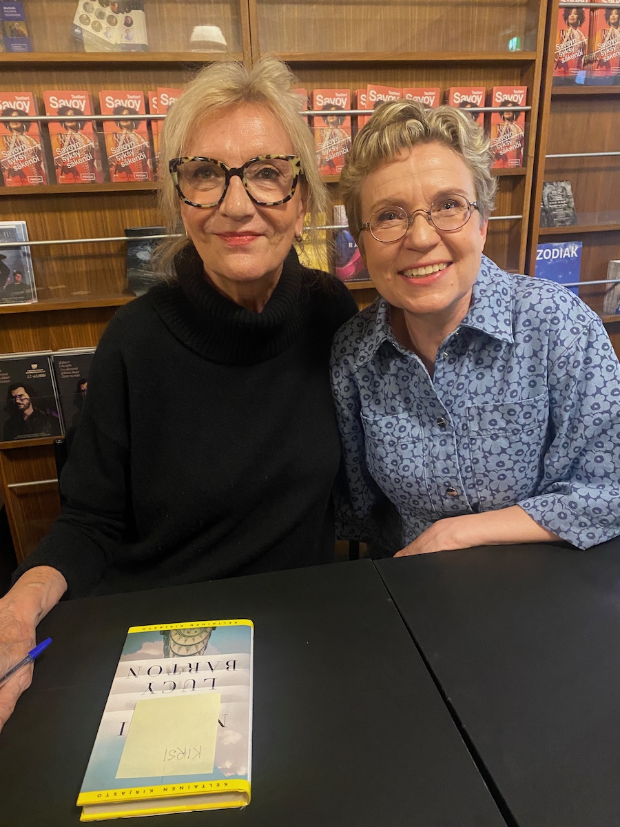 Elizabeth Strout oli kevään 2024 odotetuin vieras Helsinki Litissä, jossa häntä haastatteli Sirpa Kähkönen. Kuvassa molemmat kirjailijat ja Stroutin edessä lukupiirissä yhdessä lukemamme Nimeni on Lucy Barton, johon Kirsi on juuri saamassa omistuskirjoituksen.