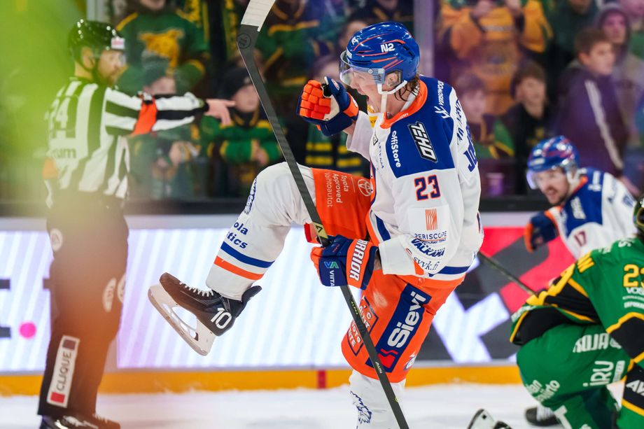 Ilves-kasvatti kiskaisi komealla laukauksella kirvesrinnat toisessa erässä johtoon 2–1 ja tuuletti riehakkaasti osumaansa.
