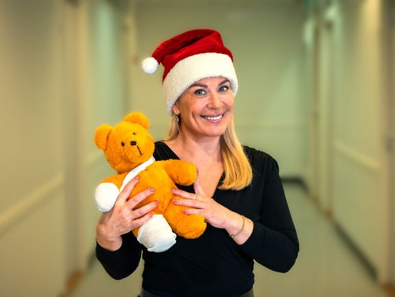 Nyt Kirsi voi kertoa toisestakin spesiaalityöstään. Hän poseeraa pehmonallen kanssa ja joulutonttulakki päässään mainoskuvassa, jossa tehdään tunnetuksi Lastenklinikan Kummien JouluMielelle-konserttia.