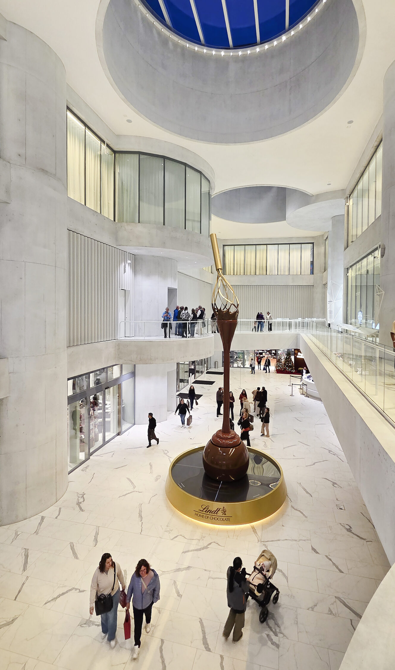 Jo saapuminen elämysmuseon aulaan salpaa hengen. Rakennus on moderni, Lindt – Home of Chocolate -museon avajaisia vietettiin syyskuussa 2020. Sisäaula on 64 metriä pitkä ja 13 metriä leveä; korkeutta sillä on 15 metriä.