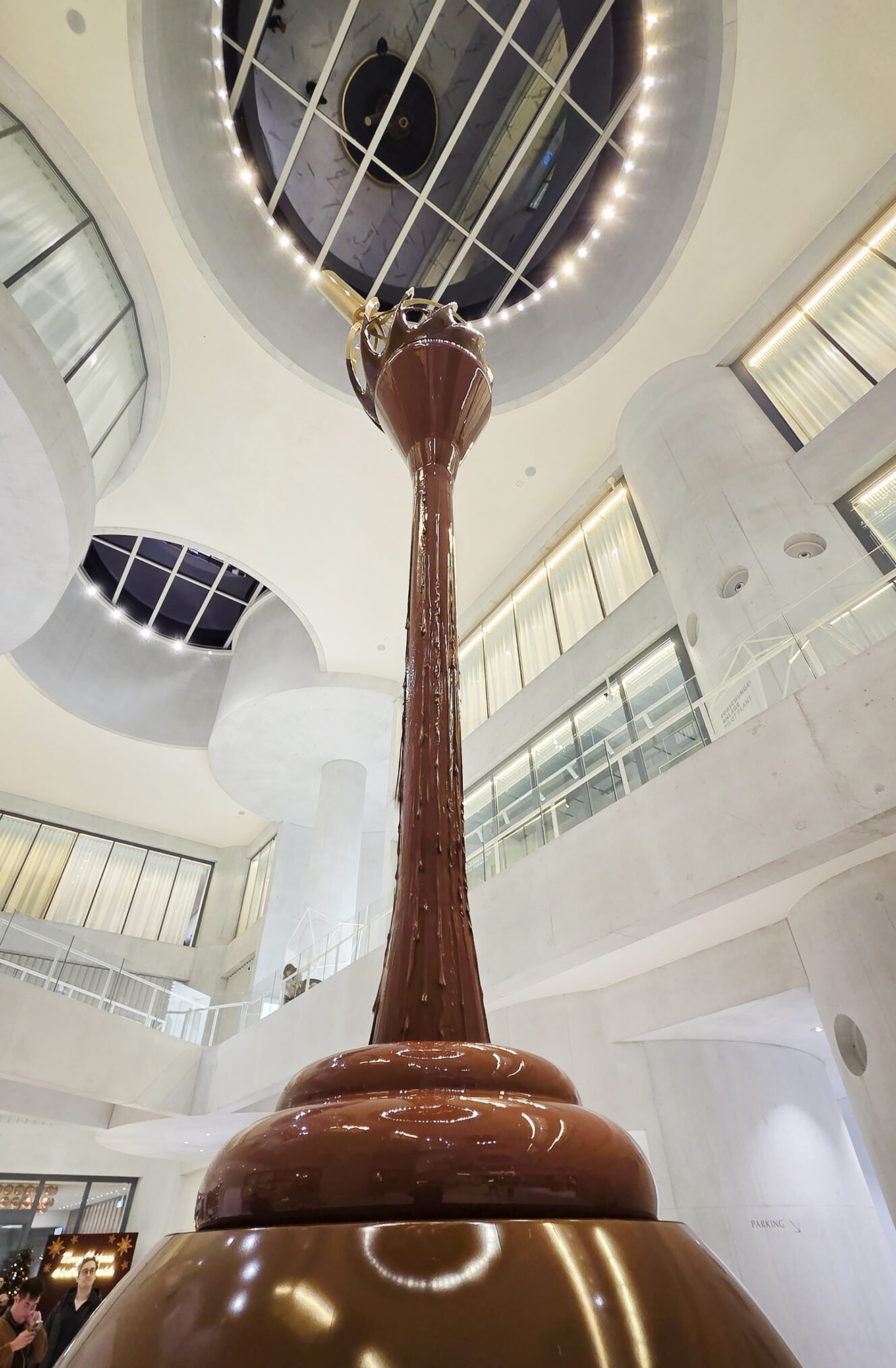 Vaalealla kivellä ja keramiikalla kauttaaltaan vuoratun aulan keskellä on vielä eräänlainen alttari eli 9,3 metriä korkea suklaalähde. Sen 94-metrisessä putkistossa kiertää noin 1000 litraa suklaata. Sitä valuu alaspäin noin kilo per sekunti tahdissa. Jo tässä vaiheessa herahtaa vesi kielelle.