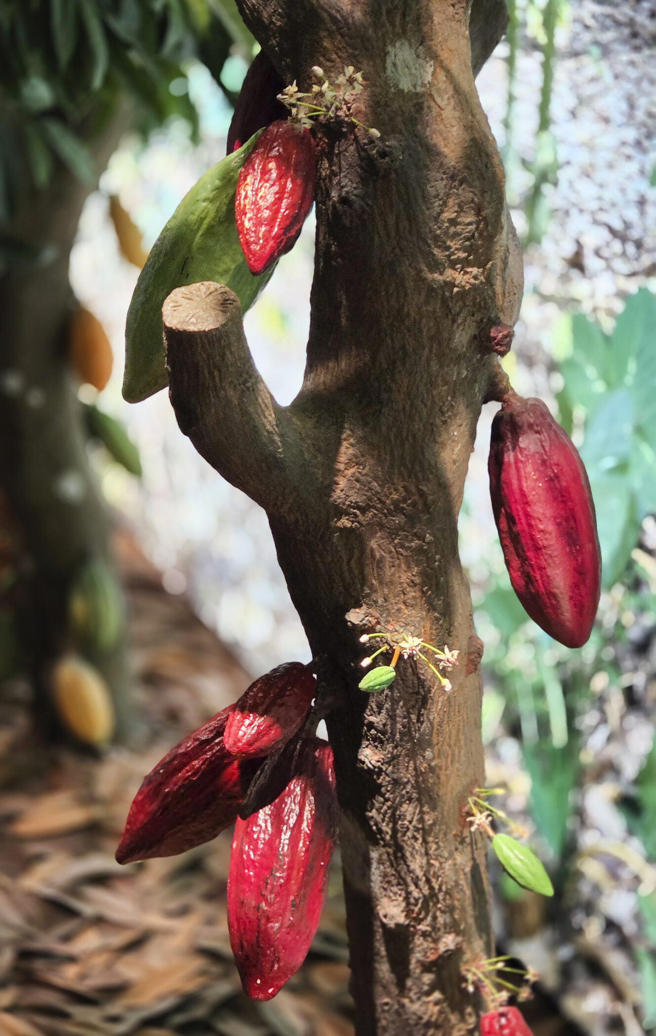 Vierailija kävelee heti museon sisäänkäynnin jälkeen kaakaopuiden alta ihmetellen niiden hedelmien kokoa. Ne ovat noin 17–20 senttiä pitkiä. Hedelmien sisällä sijaitsee tyypillisesti 30–40 siementä, joista kaakaopavut tuotetaan. Kiloon suklaata tarvitaan noin 300–600 papua.