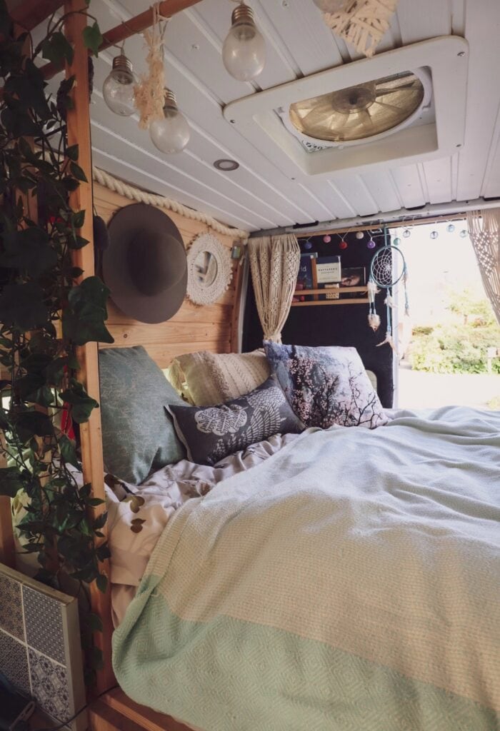 – Aiemmassa retkeilyautossamme oli kauniit käsintehdyt makrameeverhot. Ne eivät valitettavasti sopineet uuteen retkeilyautoomme ja kieltämättä hieman kaipaan tällä hetkellä verhojen tuomaa tunnelmaa makuuhuoneeseen, Matila harmittelee.