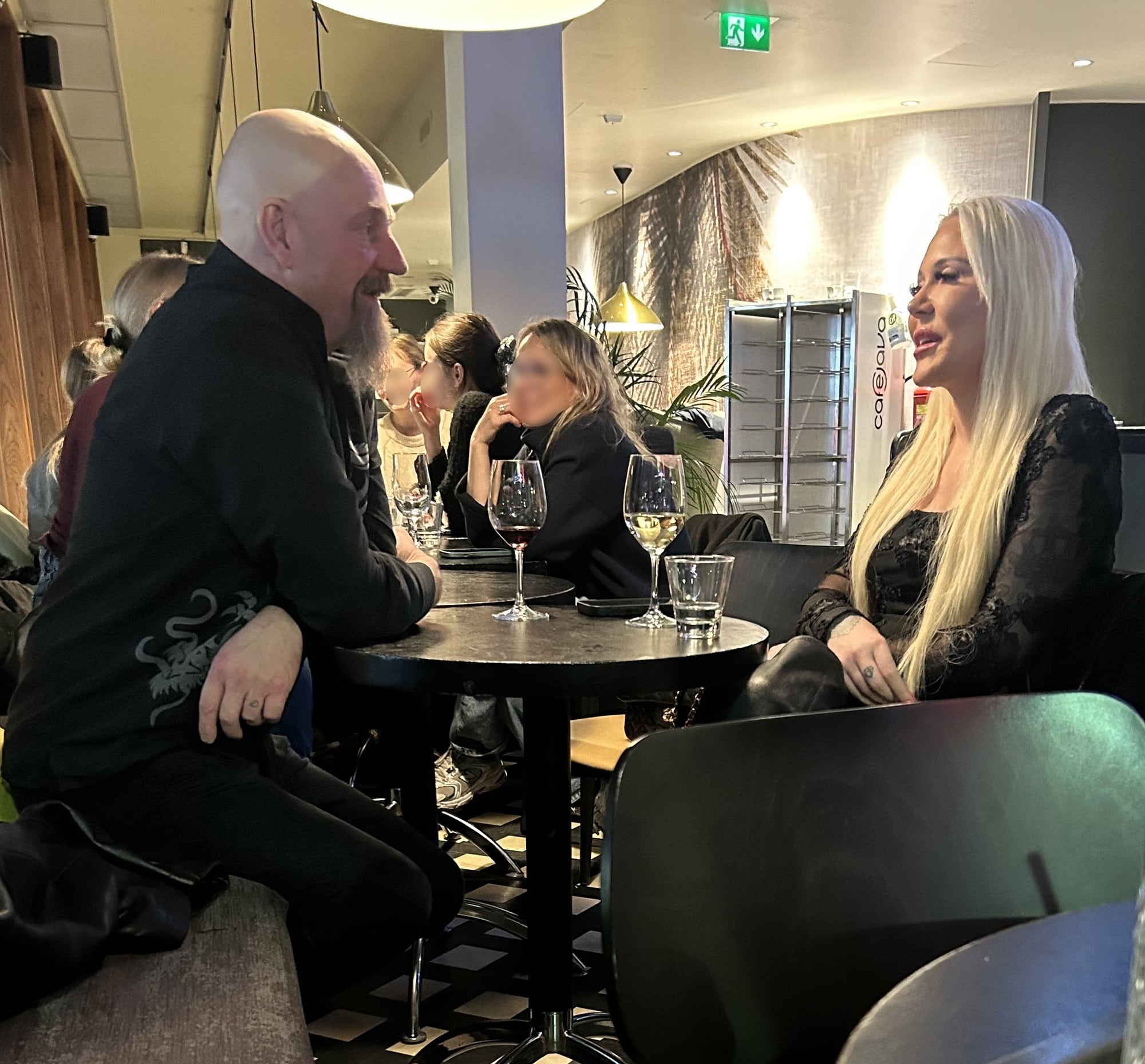 Sheikki Laakso ja Sandra Bay viettivät iltaa tiiviisti yhdessä, jutellen ja viiniä siemaillen. Gekkosen lukijan kuva