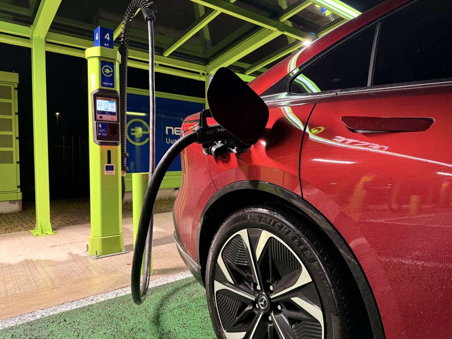Päästöleikkausta edullisemmin? Mazda 6e -sähköauto latauksessa Neste Sipoonlahti Söderkullassa. Henri Posa