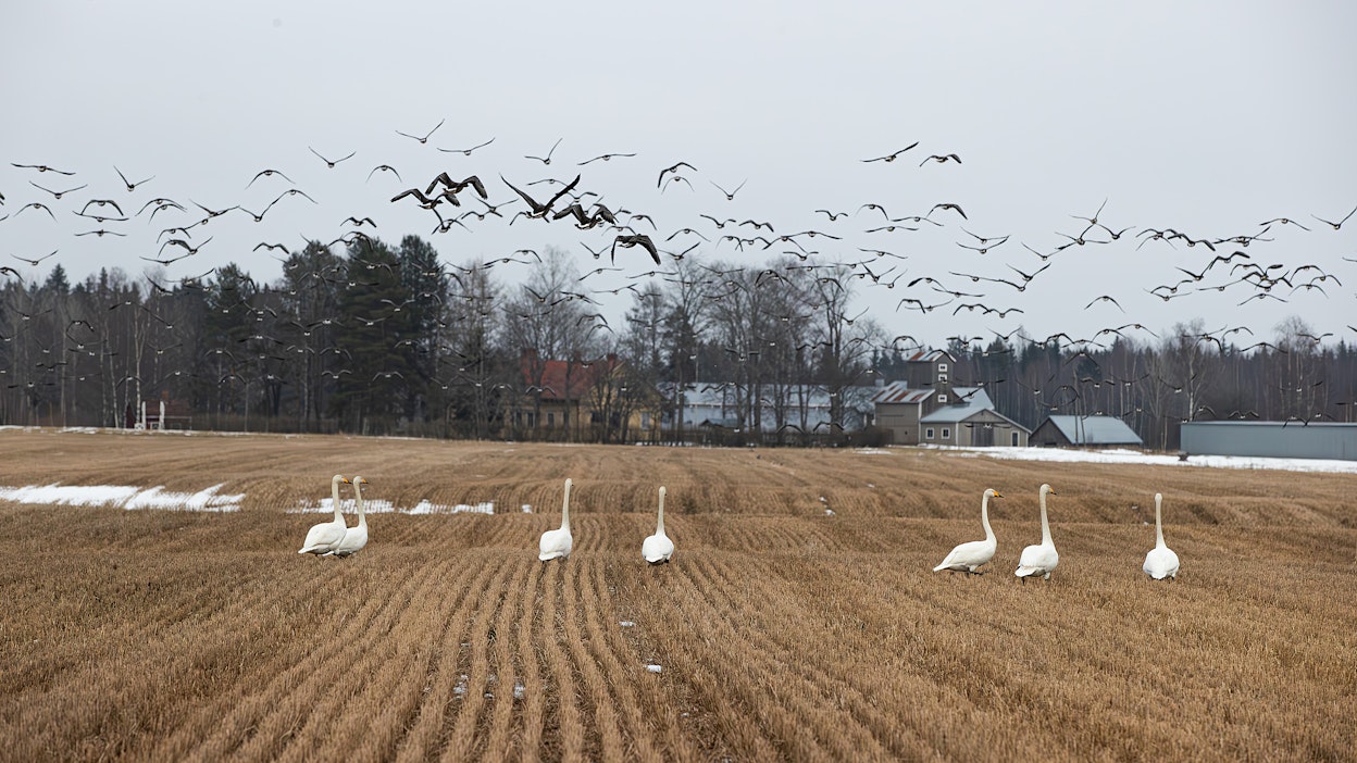 Joutsenia pellolla ja hanhia ilmassa Kanta-Hämeessä. Kuvituskuva. Kuva: Jaana Kankaanpää
