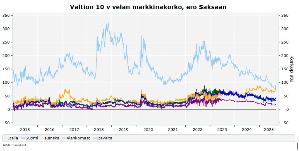 Onneksi velan määrä ei vielä ole ongelma. Valtion velan koron ero vähäisen riskin velan korkoon – kuten esimerkiksi Saksaan – olisi ensimmäinen signaali velkaisuuden ongelmasta. Ero ei ole revennyt, vaikka railo onkin kasvanut siitä mitä se oli vielä vuonna 2015.