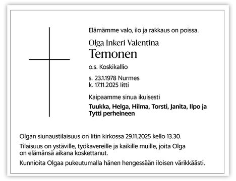 Maanantaina kuolleen näyttelijä Olga Temosen kuolinilmoitus julkaistiin Helsingin Sanomissa sunnuntaina.