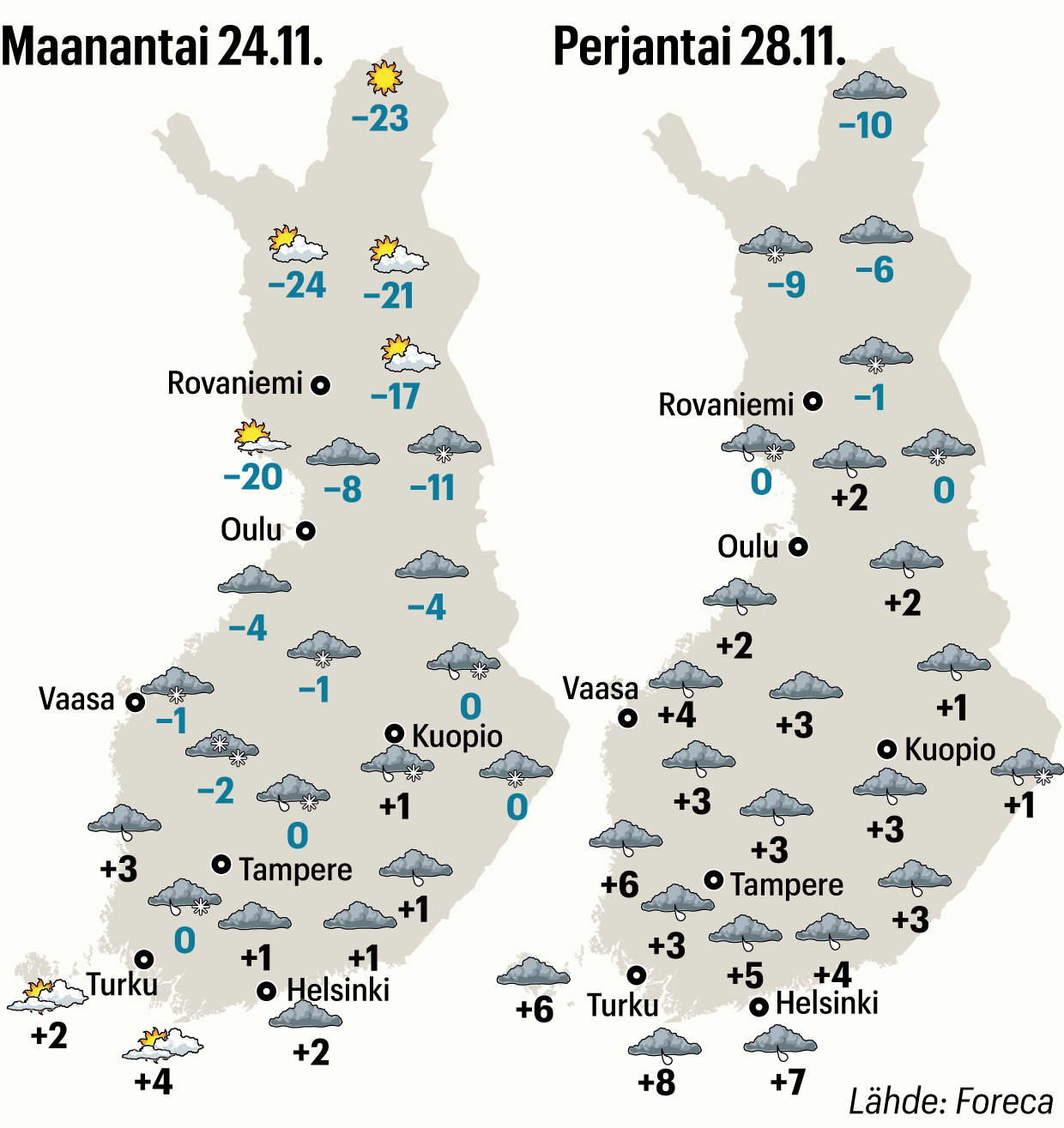 Hän sanoo, että vielä alkuviikosta sää jatkuu samanlaisena kuin tähänkin asti. Pohjoisessa lämpötila voi laskea alle 20 pakkasasteeseen, mutta kovimmat pakkaset alkavat helpottaa keskiviikkona.