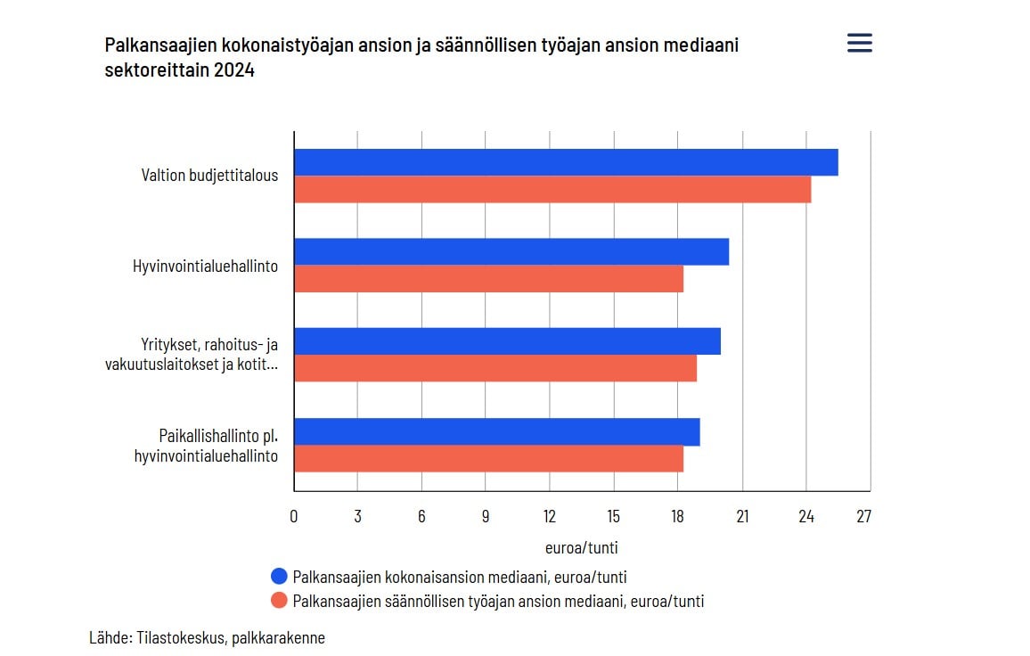 Hyvinvointialuehallinnon sektorilla keskimääräiselle palkansaajalle maksettiin eniten lisä- ja ylityöajan ansioita sekä muita kokonaisansion lisiä verrattuna muihin sektoreihin. Tämä käy ilmi säännöllisen työajan ansion ja kokonaisansion mediaanien erosta, joka on suurin hyvinvointialuehallinnossa. Pienin ero säännöllisen työajan ansion ja kokonaisansion mediaaneissa on sen sijaan muussa paikallishallinnossa, johon kuuluu muun muassa kunnat ja kuntayhtymät.