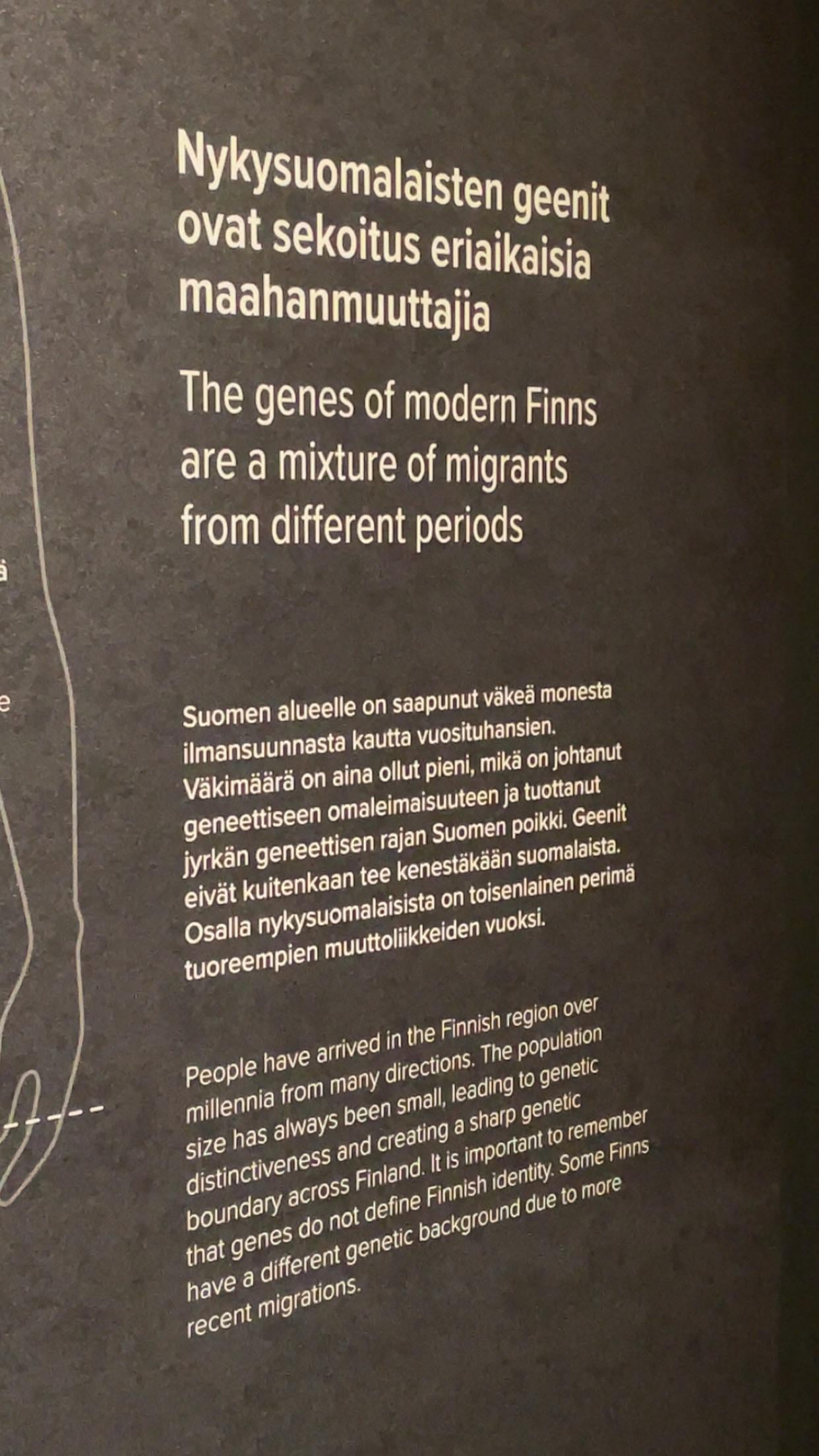 During the summer, I visited the history museum, where they had an exhibition about ancient DNA. I was walking around looking at the artefacts and reading the history, amongst which is written “It is important to remember that genes do not define Finnish identity.”