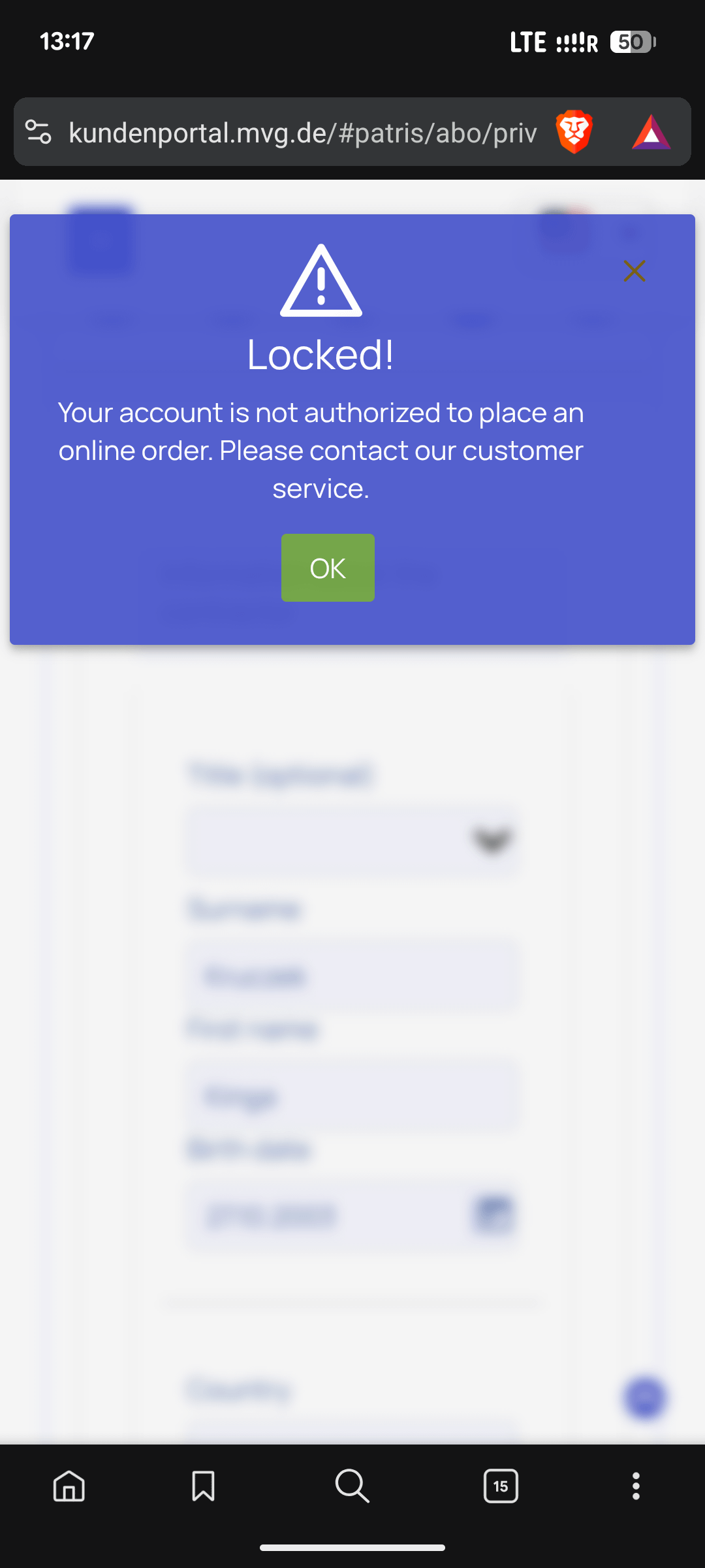I was trying to buy a reduced Deutschland ticket on Munich MVV's website and this is what happened before payment (multiple times). In the past, there was a problem with SEPA direct debit because of my foreign account, but I changed the payment method to a German bank account and it worked twice. I tried contacting the customer service through the website, but it's bugged and freezes every time I try to send a message. I also sent emails to abocenter@mvg.de and no replies. Does anyone know what to do? I can't afford to regularly buy the full Deutschland ticket, which I already did this month. Do they have a physical customer service location in Munich perhaps? I tried to ask on Munich subreddit but the bot marked this post as not related to Munich.