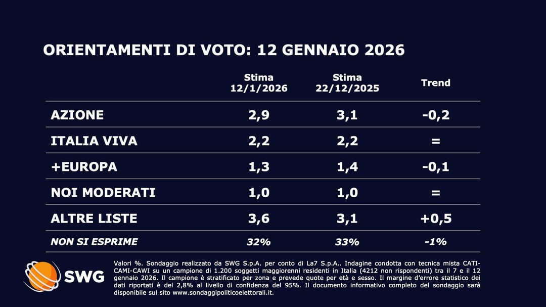 Gradirei comprendere quanto si discosta, rispetto agli ultimi sondaggi politici rilevati da SWG per La7, la popolazione di Reddit che entra in contatto con questo post. Noto che qui non è possibile effettuare sondaggi, quindi sarebbe più una raccolta di consensi indicativa basata sugli upvote