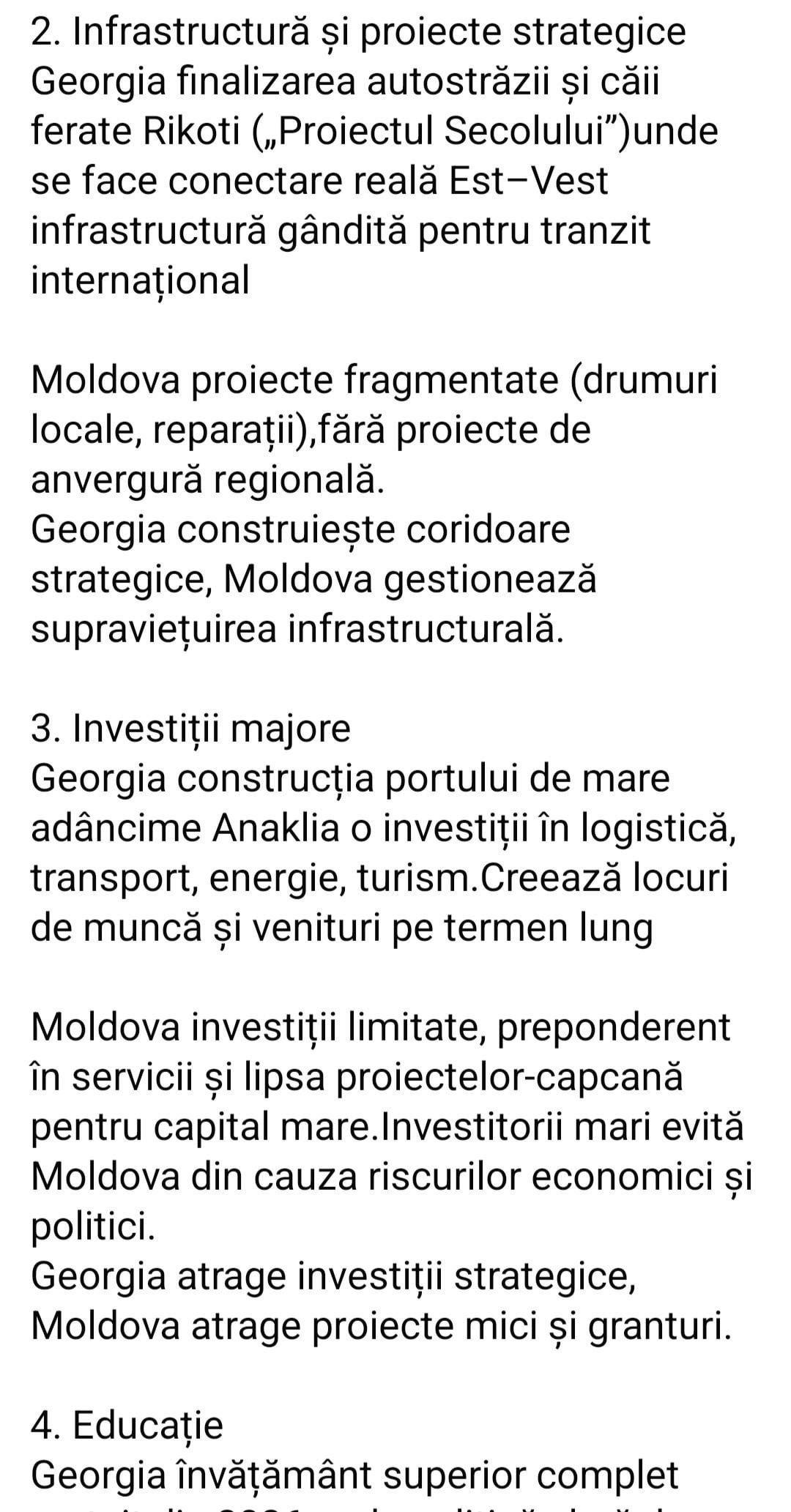 Asta nu e membru (sau chiar lider) al partidului pro-rus ”Inima Moldovei”? Daca da, e evident de ce textul e o mare abureala si nu se specifica deloc, de exemplu, faptul ca investitiile Georgiei sunt facute prin indatorare masiva fata de China si coruptie pentru partidul la putere. Totul e prezentat foarte subiectiv si incorect pentru a se inocula ideea gresita cum ca Georgia pro-rusa, corupta, dictatoriala, oligarha, datoare Chinei (portul acela cel msai probabil va ajunge ca multe altele sub controlul Chinei pentru banii datorati) ar trai foarte bine si s-ar dezvolta de mama focului, in timp ce R. Moldova pro-UE ar trai tare prost si nu s-ar dezvolta deloc.