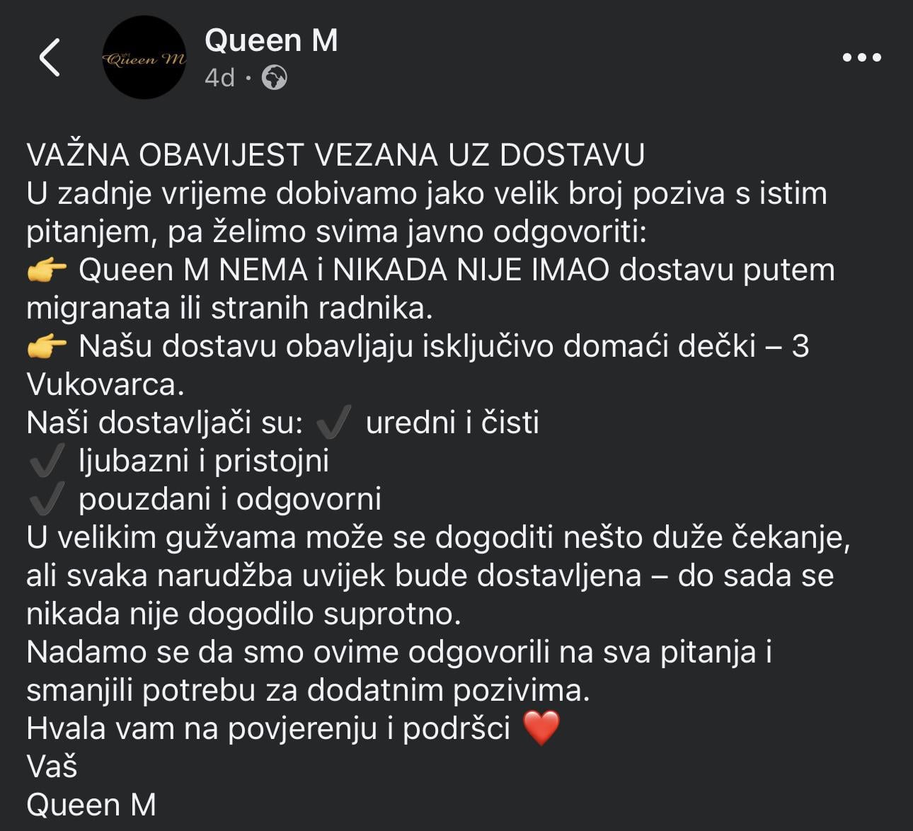 Umjesto da se priča o usluzi, brzini ili profesionalnosti, dobili smo javno ograđivanje od *migranata*, kao da je to neka posebna sigurnosna garancija.