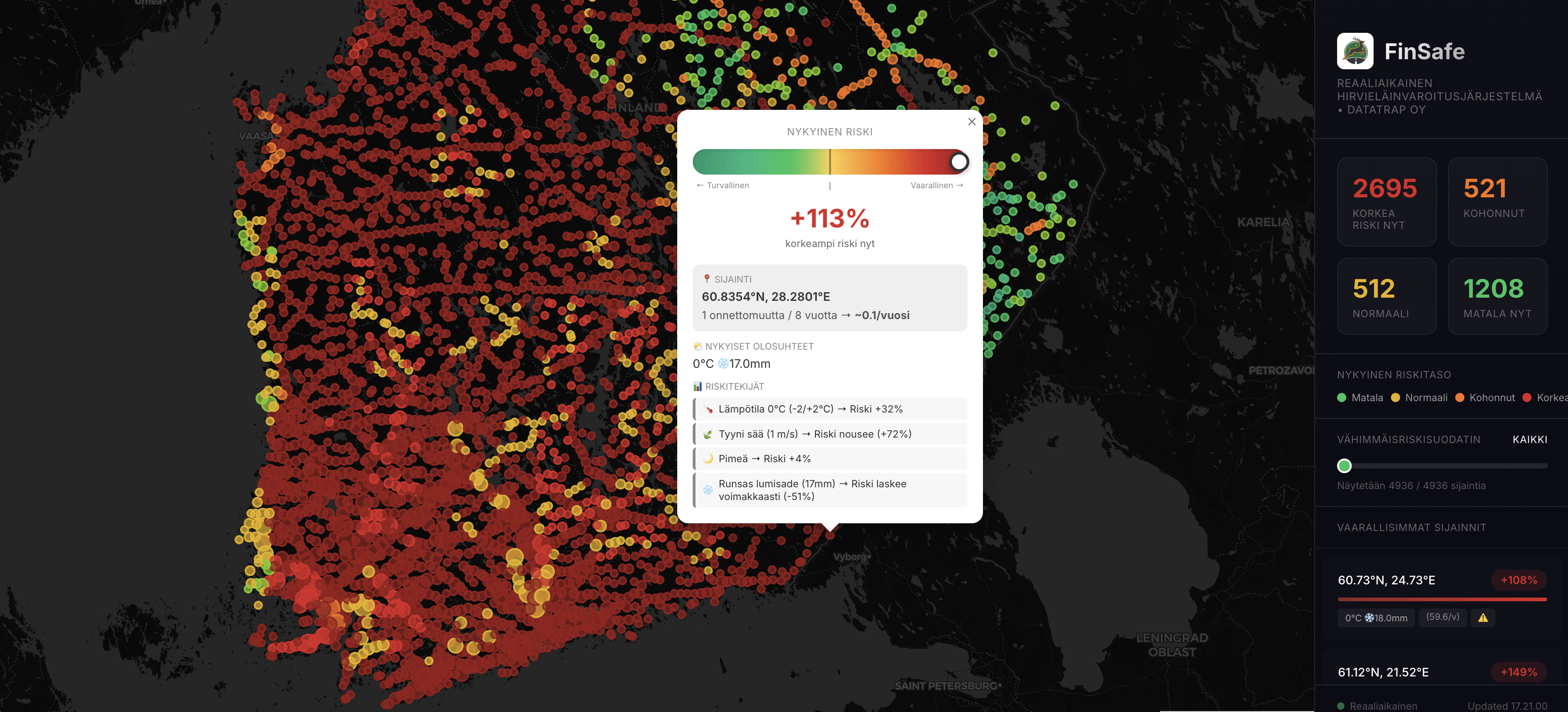We analyzed 103,386 verified wildlife collisions in Finland and combined them with live weather, daylight simulation, and seasonal patterns.