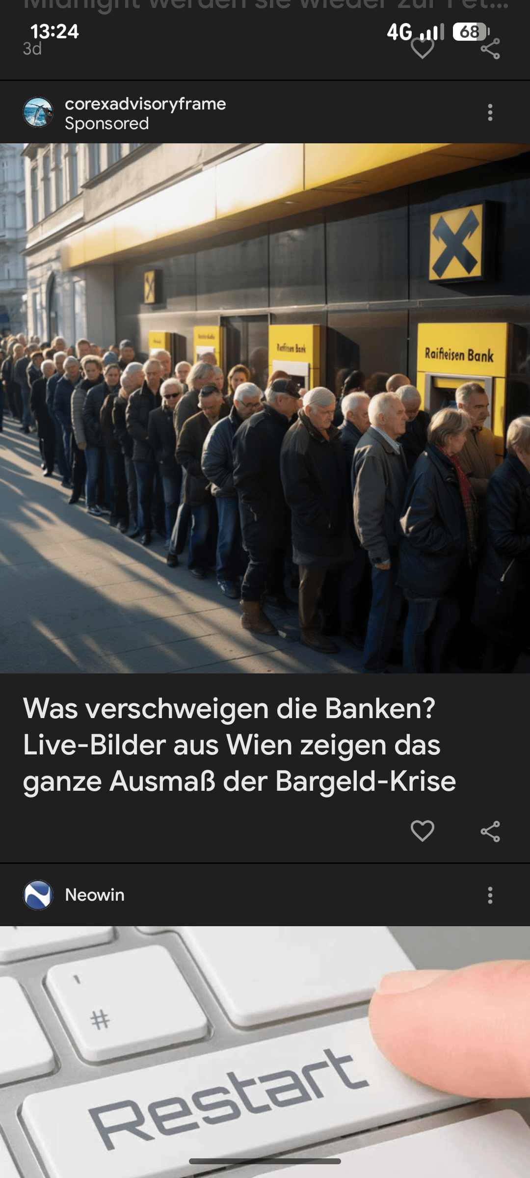seit Tagen bekomme ich Werbung von Google geschaltet, die eine angebliche Bargeld-Krise in Österreich melden. Bis jetzt habe ich die KI-generierten Bilder von Werbeträger aus Indien, UAE und Südkorea bekommen. Habe alle gemeldet.