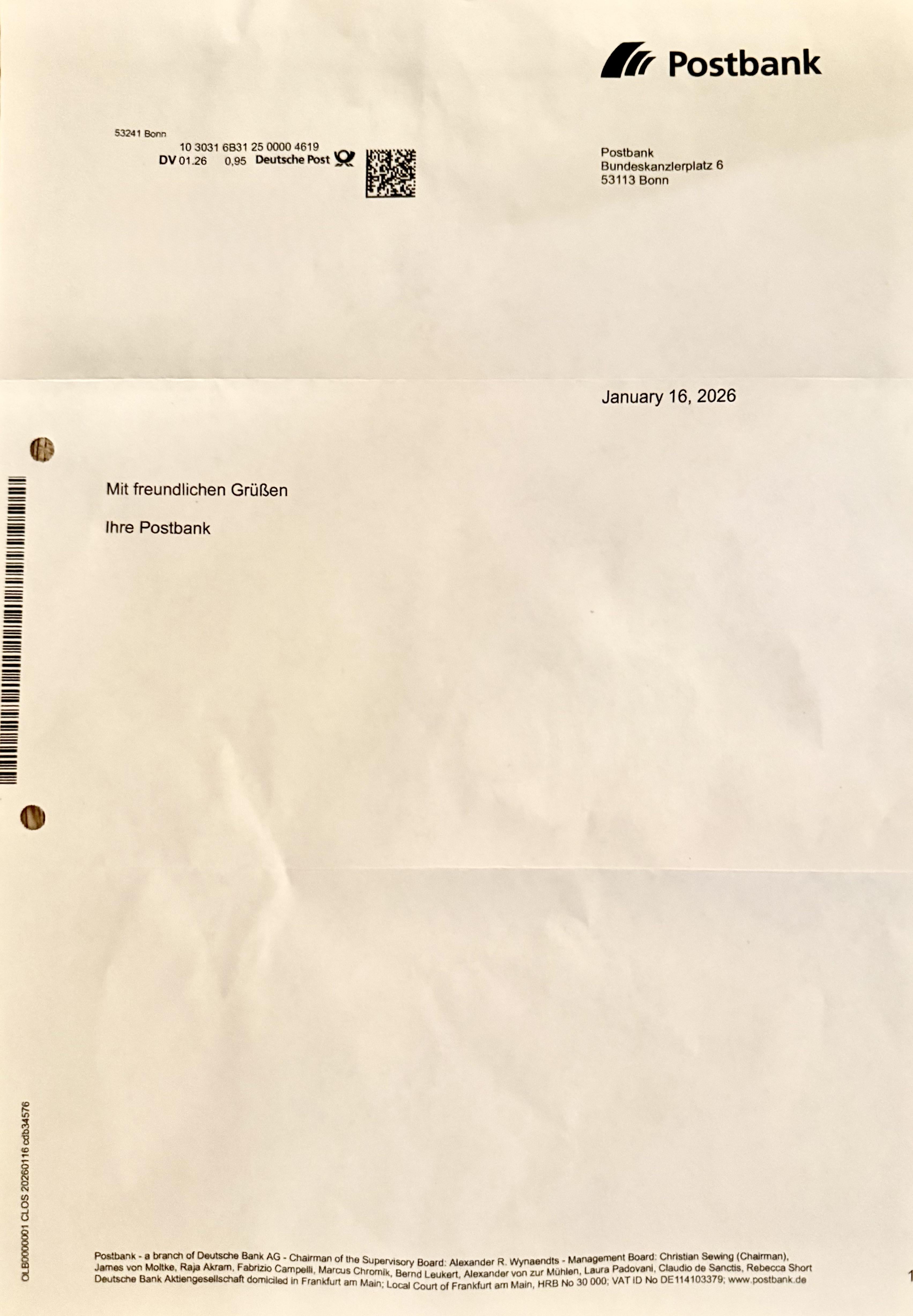 Today I received a letter from Postbank, only the message as shown in the photo. Do I need to heat the paper for the hidden message? — AlternativeLawyer511 Tags:Germany Leave a ReplyYou must be logged in to post a comment.