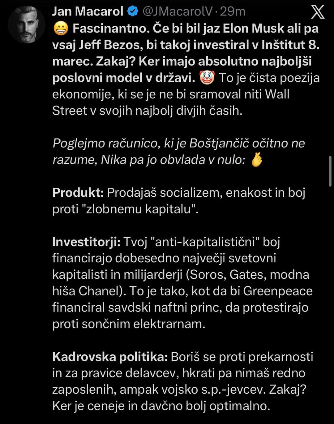 Jan Macarol je klovn. Se en od nestetih online grifterjov k ni poslusu pr drzavljanski vzgoji pa vseen misl da lahko in mora politiko komentirat. Ne zna si niti predstavlat, da bi liberaln glas k ga predstavla I8M lahko mel kakrsnkol doprinos k slovenski javni debati. Razn precej vulgarnga populizma je njegov doprinos nula.