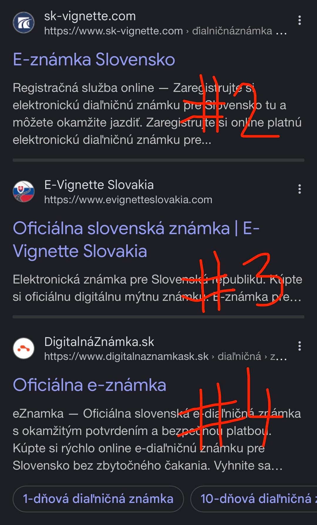 Vzhľadom na to že sa blíži čas, v ktorom veľká časť Slovákov nakupuje svoju ročnú diaľničnú známku, dajte si pri kúpe cez internet pozor na stránku cez ktorú ju kupujete. Keď sa ju budete snažiť nájsť cez Google, ako prvé 4 výsledky sa zobrazia podvodníci ktorý sa iba tvária ako oficiálna stránka a diaľničné známky Vam predajú s dodatočným “servisným poplatkom”.