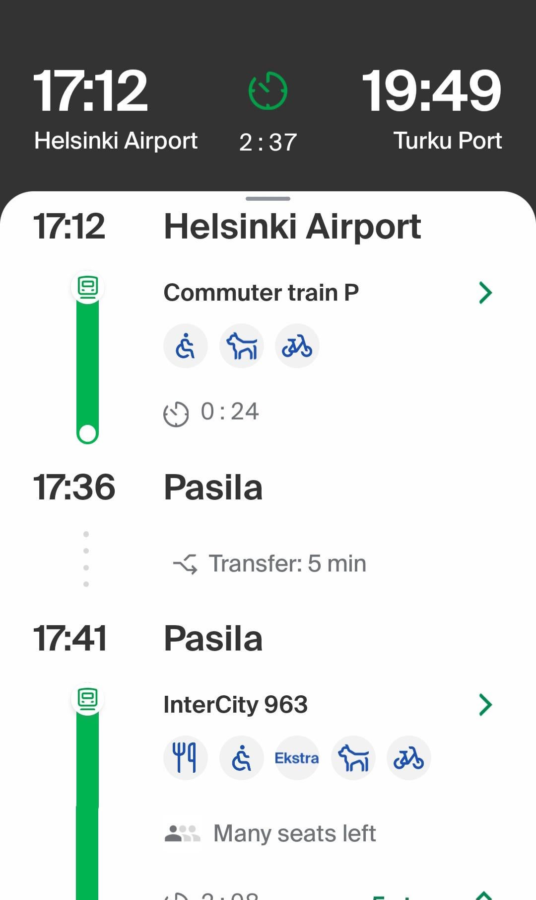 It's my first international trip, and my flight arrives in Helsinki at 3:30 PM, but I have a cruise in Turku that same day. I can only find these train schedules; the connection in Pasila is 5 minutes. Is that enough time? Or am I at risk of missing the train?