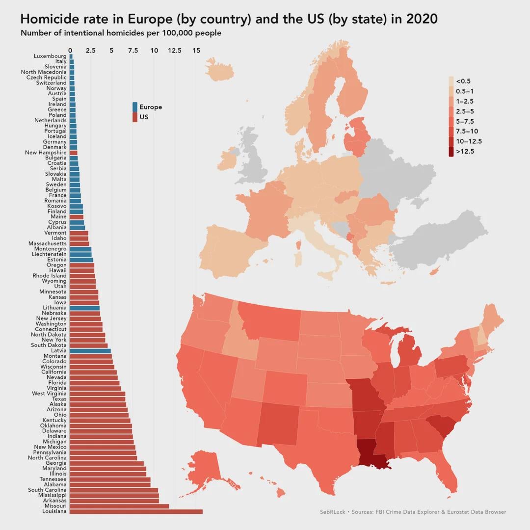 Homicide rate in European countries vs USA (states) – Italy and Luxembourg have the lowest homicide rate, while Missouri and Louisiana the highest